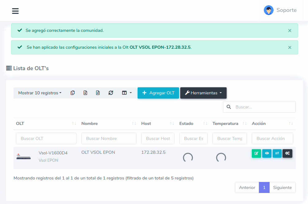 Al aplicar esta acción AdminOLT creará las comunidades que registró al momento de agregar la OLT en el sistema.
