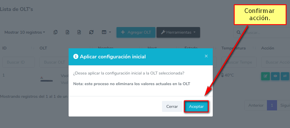 Después de aplicar las configuraciones iniciales, puede demorar entre 10-20 minutos en verse reflejados en su OLT.