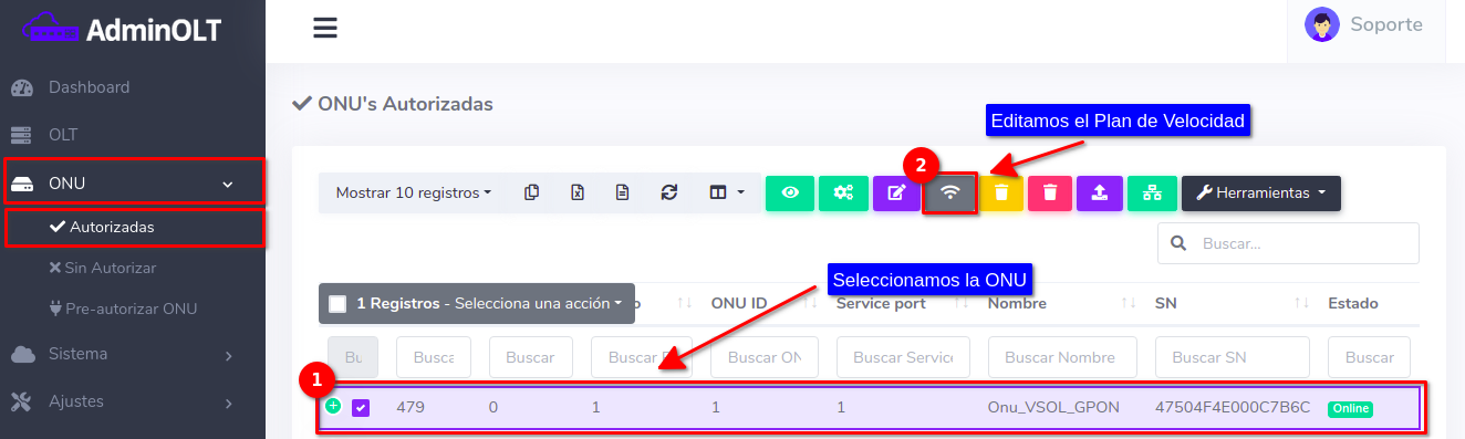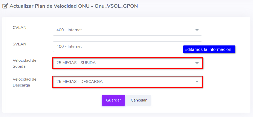 Para este ejemplo usaremos una ONU Autorizada que inicialmente tiene un Plan de 100 Megas, en este caso nosotros lo cambiaremos a un Plan de 25 Megas.