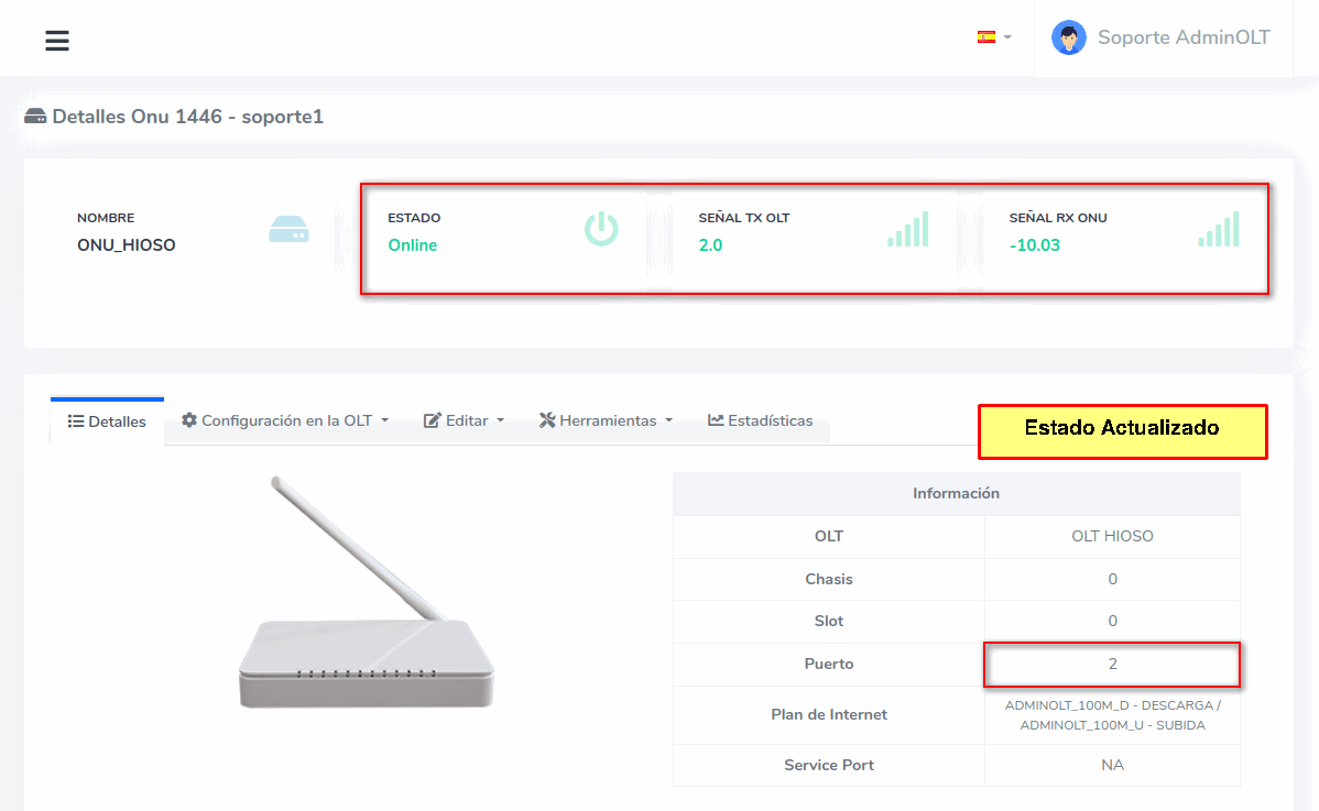 En este momento si vemos el estado de la ONU, este se encuentra en Offline debido a que físicamente no sé ha cambiado la ONU de Puerto, pero en AdminOLT si se ha actualizado la información.