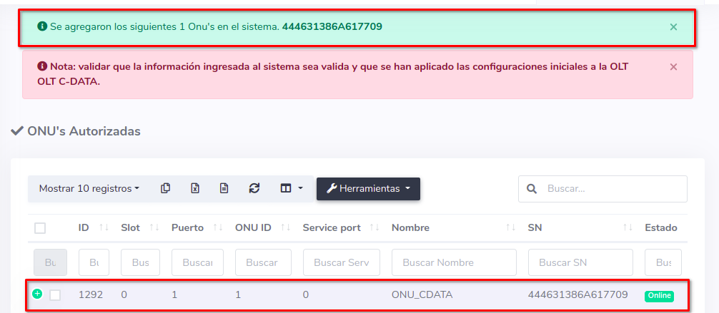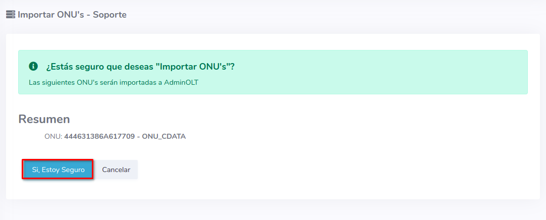 3Una vez que hayamos seleccionado los equipos, importamos las ONU's al sistema AdminOLT