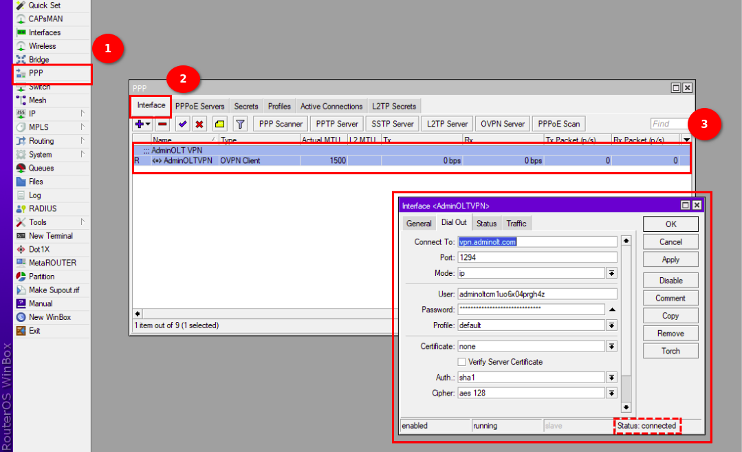 4En la terminal de su Routerboard pegamos el script generado por AdminOLT y verificamos la conexión.