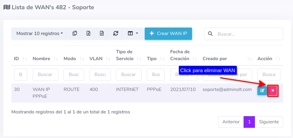 2Seleccione la opción Crear WAN IP y complete el formulario, con este proceso podrá autorizar y crear una WAN IP a una ONU al mismo tiempo.