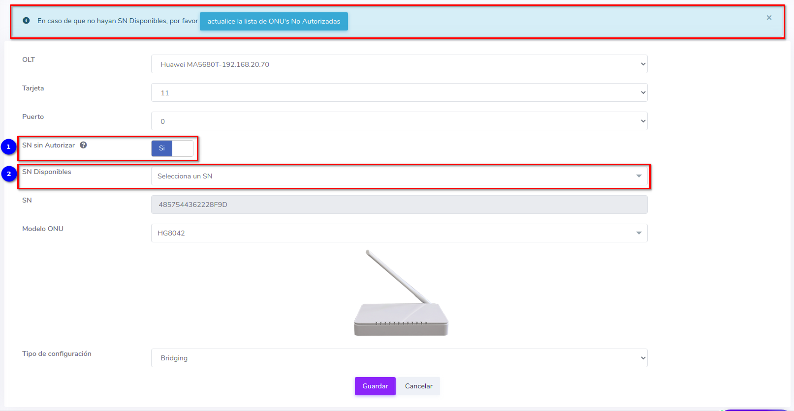 2 Activar la opción SN sin autorizar del formulario y seleccionar algún SN disponible.