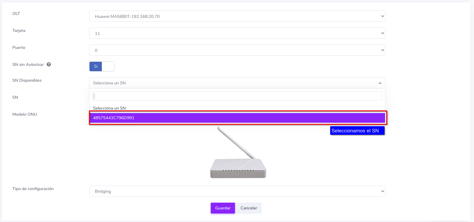 En AdminOLT podemos editar información de una ONU Autorizada en la OLT, supongamos que alguna de las ONUs que tenemos autorizadas en el sistema se estropea. Tomaremos como ejemplo esta situacion para explicar el propósito de esta función. Asi que en ese caso en AdminOLT al editar ONU por SN podemos tomar información de alguna ONU no Autorizada y usarla, sin perder la configuración inicial que teníamos.