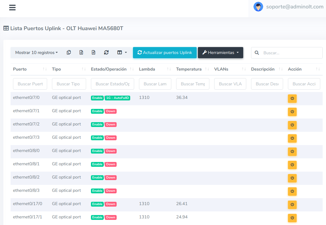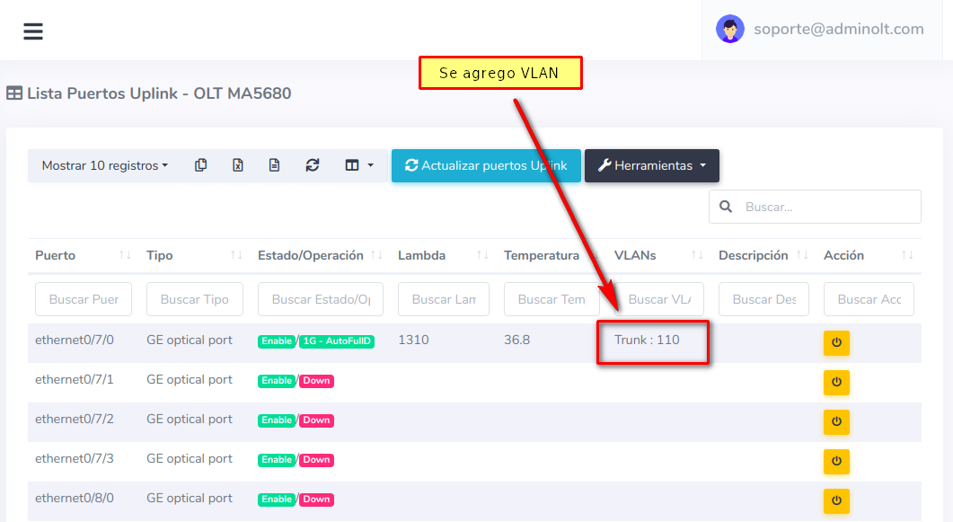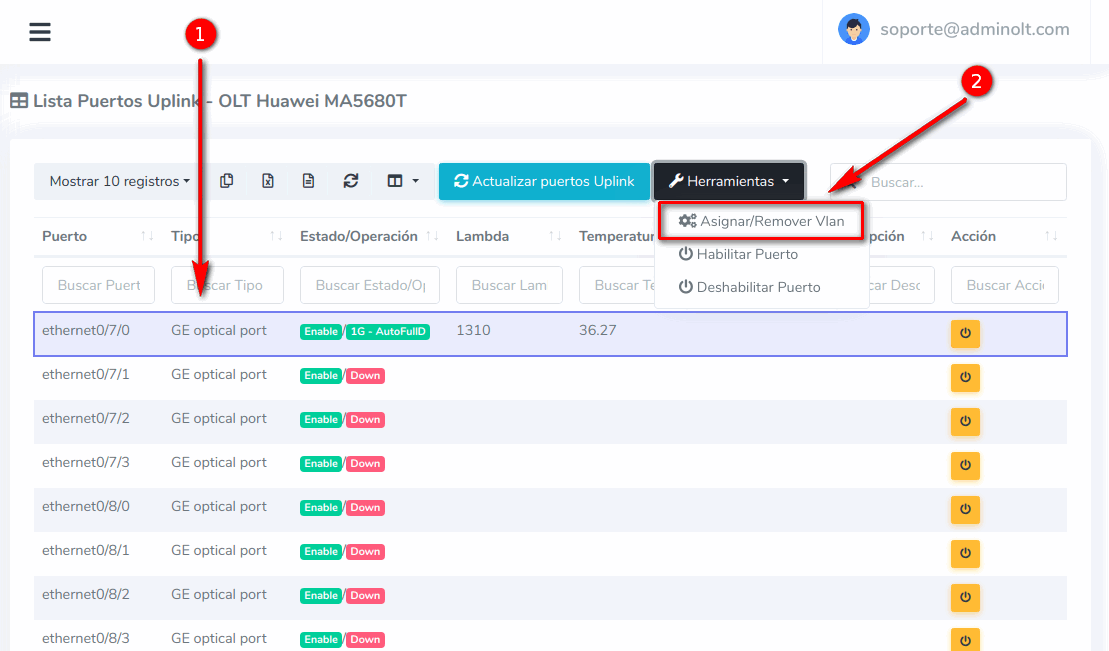 1Para habilitar los puertos Uplink, es necesario ir a la vista de "Lista OLT's" y seleccionar una OLT, despues elegir la opcion en herramientas "Puertos Uplink".