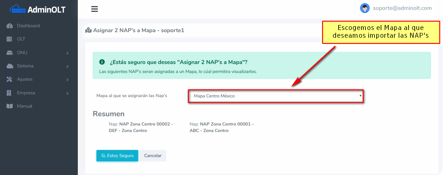 2 Escogemos las NAP’s que deseamos importar y escogemos la opción Asignar NAP’s a Mapa.
