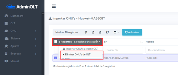1.- Eliminar la onu de AdminOLT: Esta acción eliminar la onu de AdminOLT que causa conflictos.