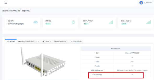 En AdminOLT es importante que las ONUs se encuentren con un service-port, si la ONU no cuenta con uno, el sistema no permitira al usuario realizar la importación de esta.