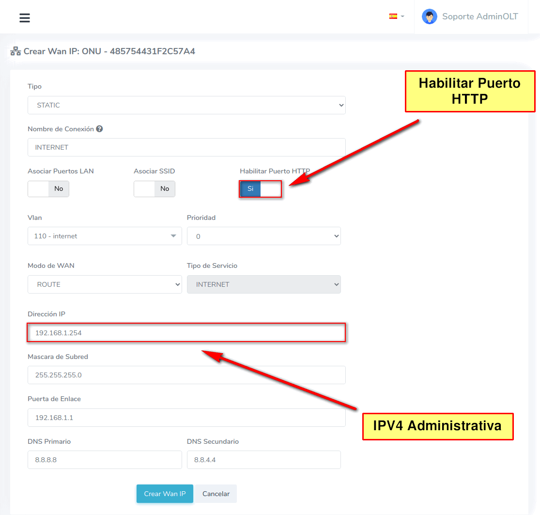 Para este paso usaremos una ip administrativa ejemplo 192.168.1.254 esto quiere decir que no usaremos la ip final del cliente, usaremos una que solo nos servirá para entrar de forma remota a la ONU, de igual forma debemos habilitar el puerto http de la ONU