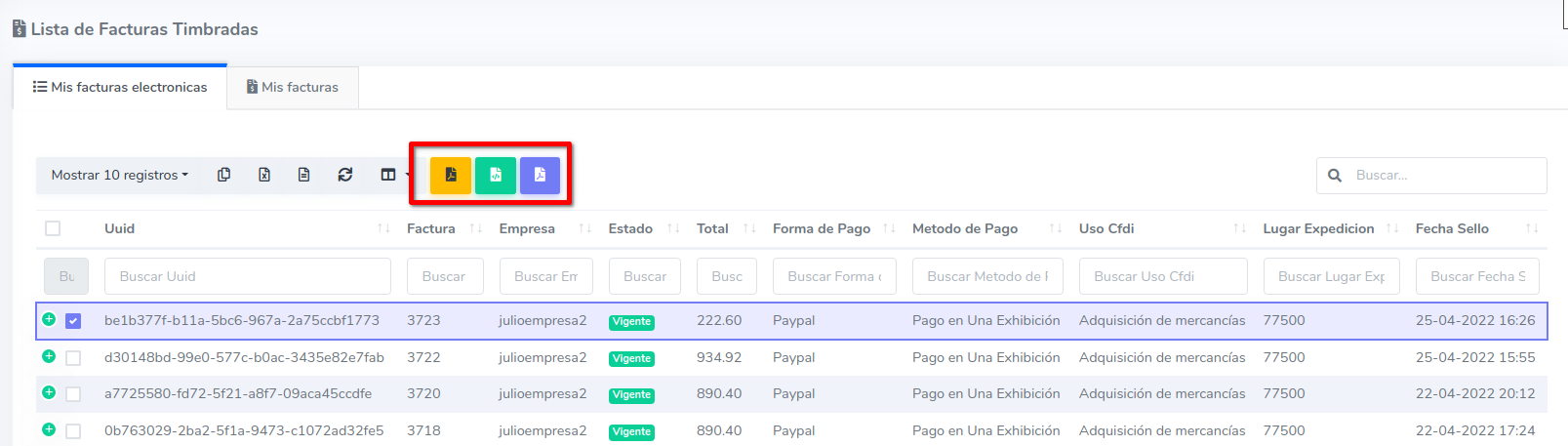 Tiene que seleccionar una factura electrónica para que le aparezca los botones el cual podrá realizar varias acciones como ver cfdi en pdf,descargar en xml y ver factura.